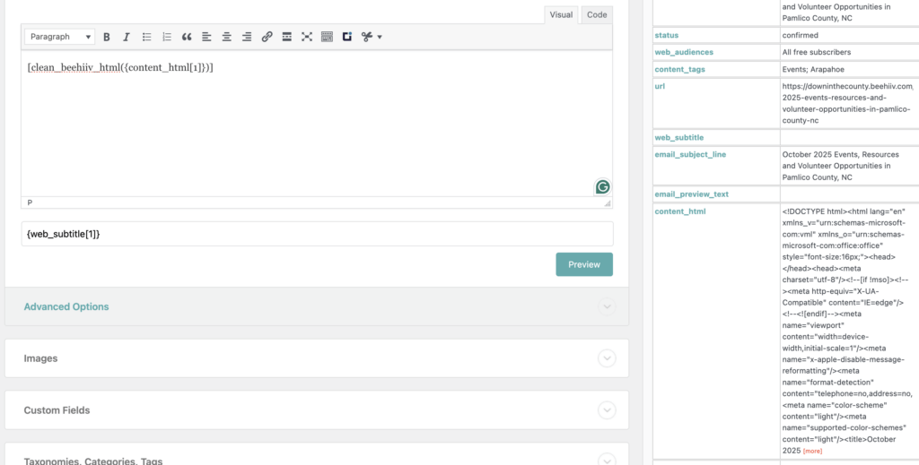 From here, you can import the CSV to your WordPress install, and the content_html will run through the custom function, cleaning out the Beehivv HTML, making it suitable for WordPress.
